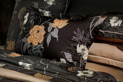 Imprimées sur un satin 120 fils/cm² en coton issu de l’agriculture biologique, des pivoines et magnolias colorés de nuances de caramel, d’ivoire et de gris souris sur fond noir ébène sont réversibles sur un motif de fines rayures mordorées.
